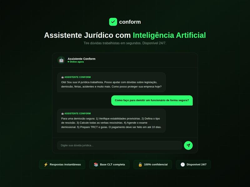 A automação é, sem dúvida, um dos grandes diferenciais da proposta tecnológica. A plataforma centraliza o gerenciamento de documentos, certidões e contratos em um único repositório acessível e sempre atualizado. Além disso, o sistema conta com alertas inteligentes de prazos legais, emitindo notificações automáticas para assegurar que nenhuma obrigação trabalhista seja negligenciada. Com a utilização da Conform Legal, a empresa estabelece uma proteção contínua, contando inclusive com orientação jurídica prática disponível 24 horas por dia para sanar dúvidas imediatas, além da possibilidade de agendamento com especialistas em casos mais complexos.