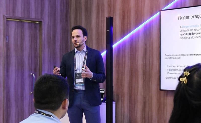 Um dos destaques foi a apresentação do cirurgião-dentista Renês Parizotto, que abordou o tema “Regeneração óssea guiada utilizando barreira de zircônia e raspadores ósseos”. Sua conferência, realizada entre 11h e 11h40, chamou atenção pela abordagem de técnicas modernas aplicadas em procedimentos de reconstrução óssea, fundamentais no campo da implantodontia.