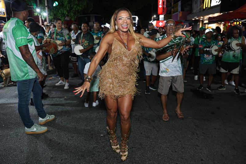 A atriz e rainha de bateria Quitéria Chagas participou, nesta terça-feira (06), do ensaio de rua do Império Serrano, em Madureira, reafirmando sua ligação histórica e afetiva com a tradicional escola da Zona Norte do Rio. Para o Carnaval 2026, a agremiação levará para a avenida um enredo em homenagem à escritora Conceição Evaristo.
